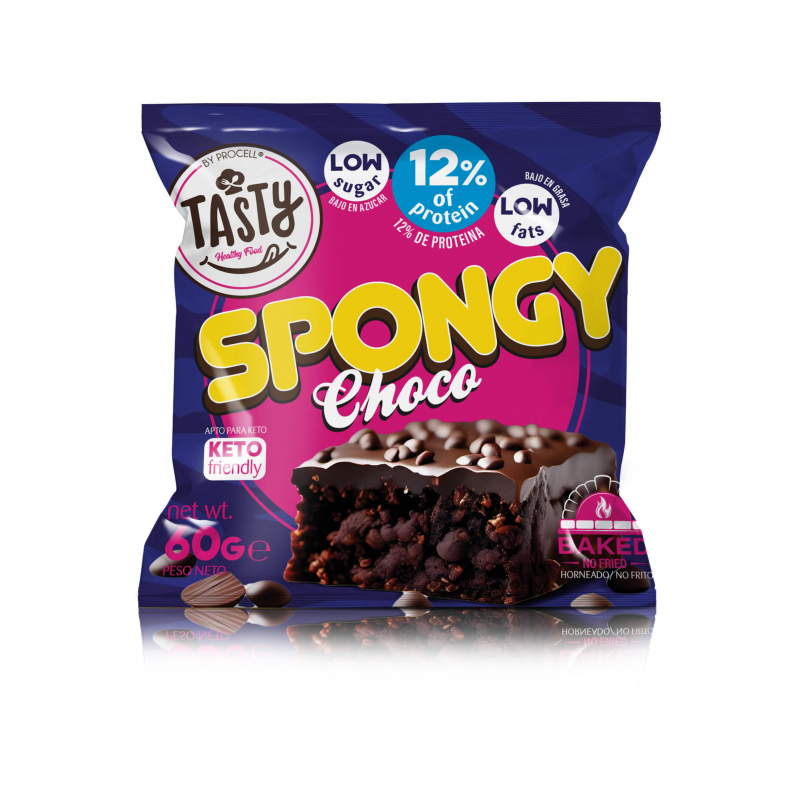 Spongy son unos bizcochitos estilo brownie con una base suave y quebradiza, con una rica capa de chocolate en la parte superior y chispas de chocolate por encima y por todo el producto.