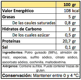 | Carne de potro 98%, almidón de maíz, especias, cebolla, ajo, SULFITO sodico, citrato sodico, ascorbato sodico, carmin.