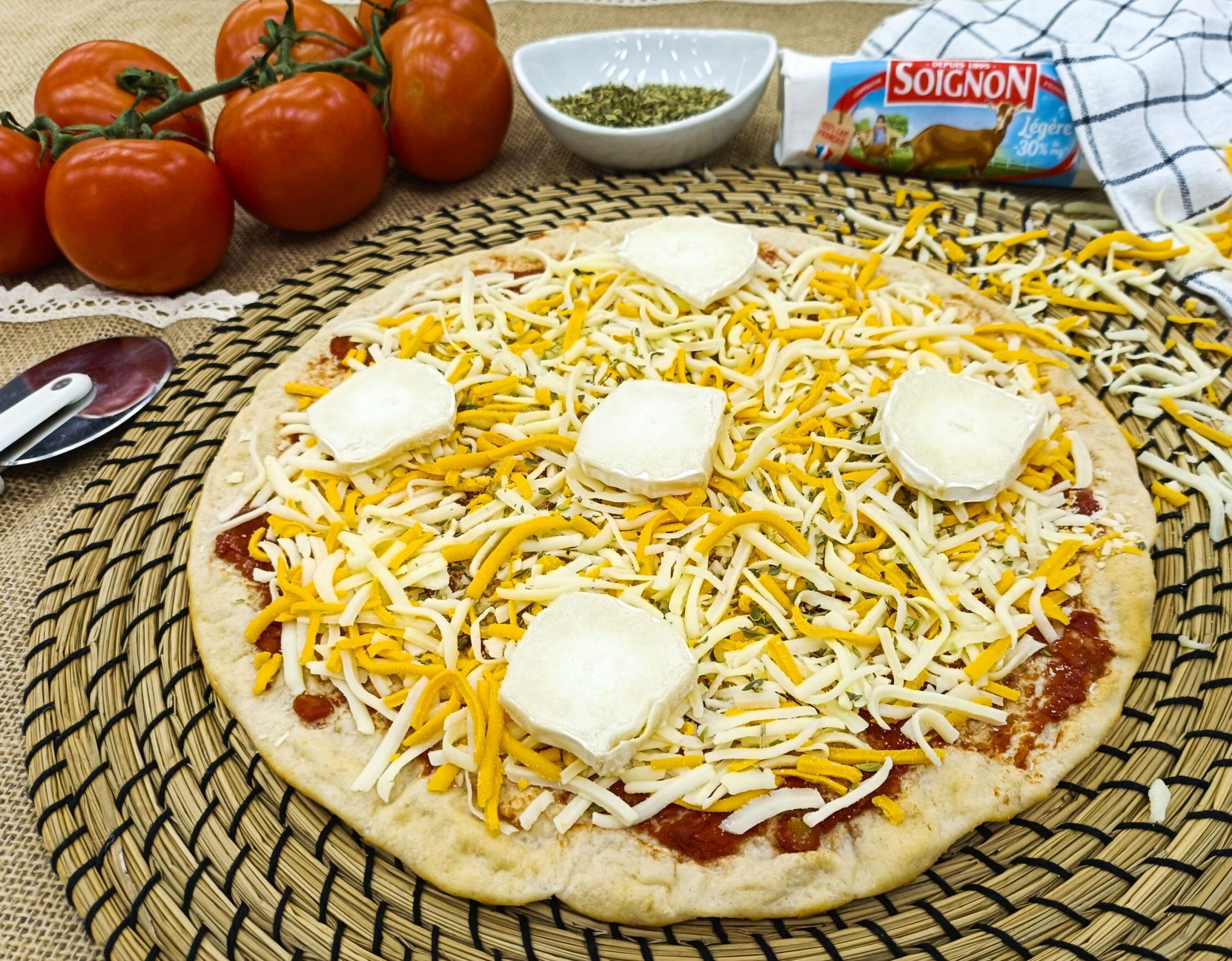 La mezcla de quesos —mozzarella, edam, mimolette y rulo de cabra light— se funde sobre una capa de tomate con orégano para lograr ese sabor intenso que conquista a cualquier amante del queso.